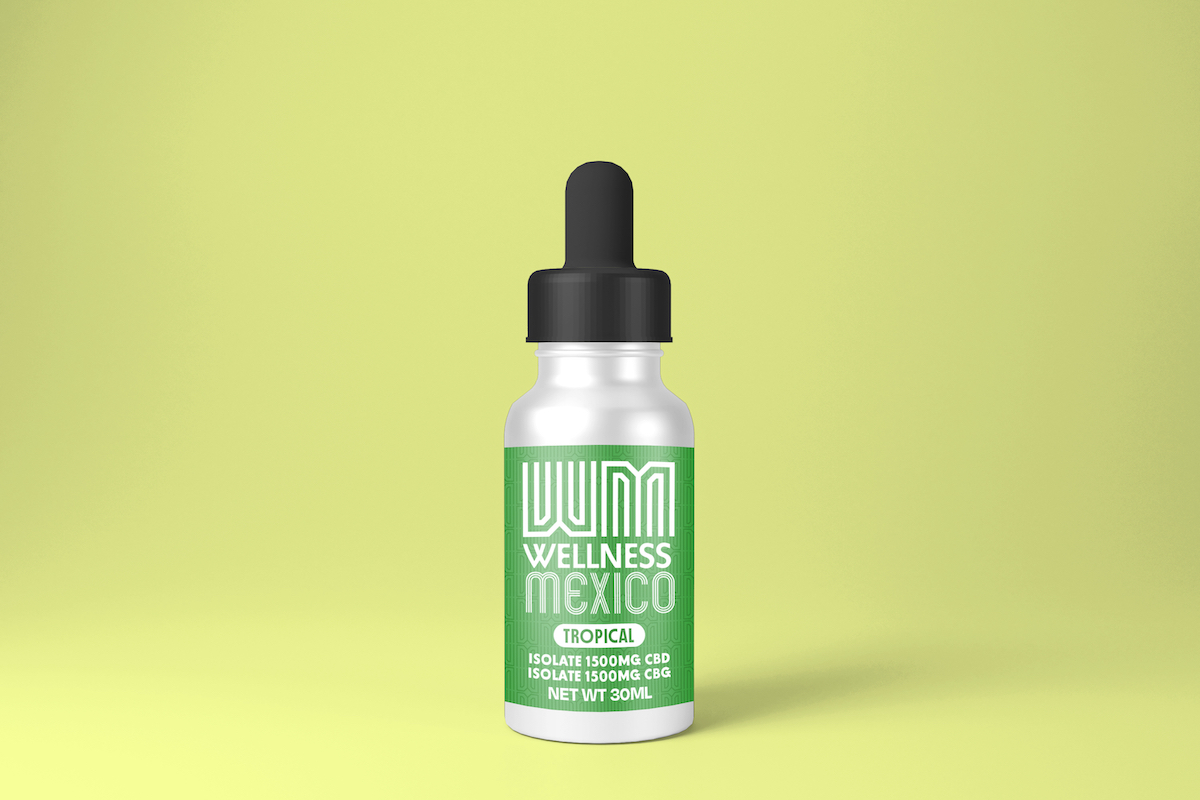 Tintura de marca privada con 1500 mg de aislado de CBD y 1500 de aislado de CBG, base de MCT, sabor tropical, frasco de vidrio blanco mate de 30 ml con tapón gotero graduado negro a prueba de niños.